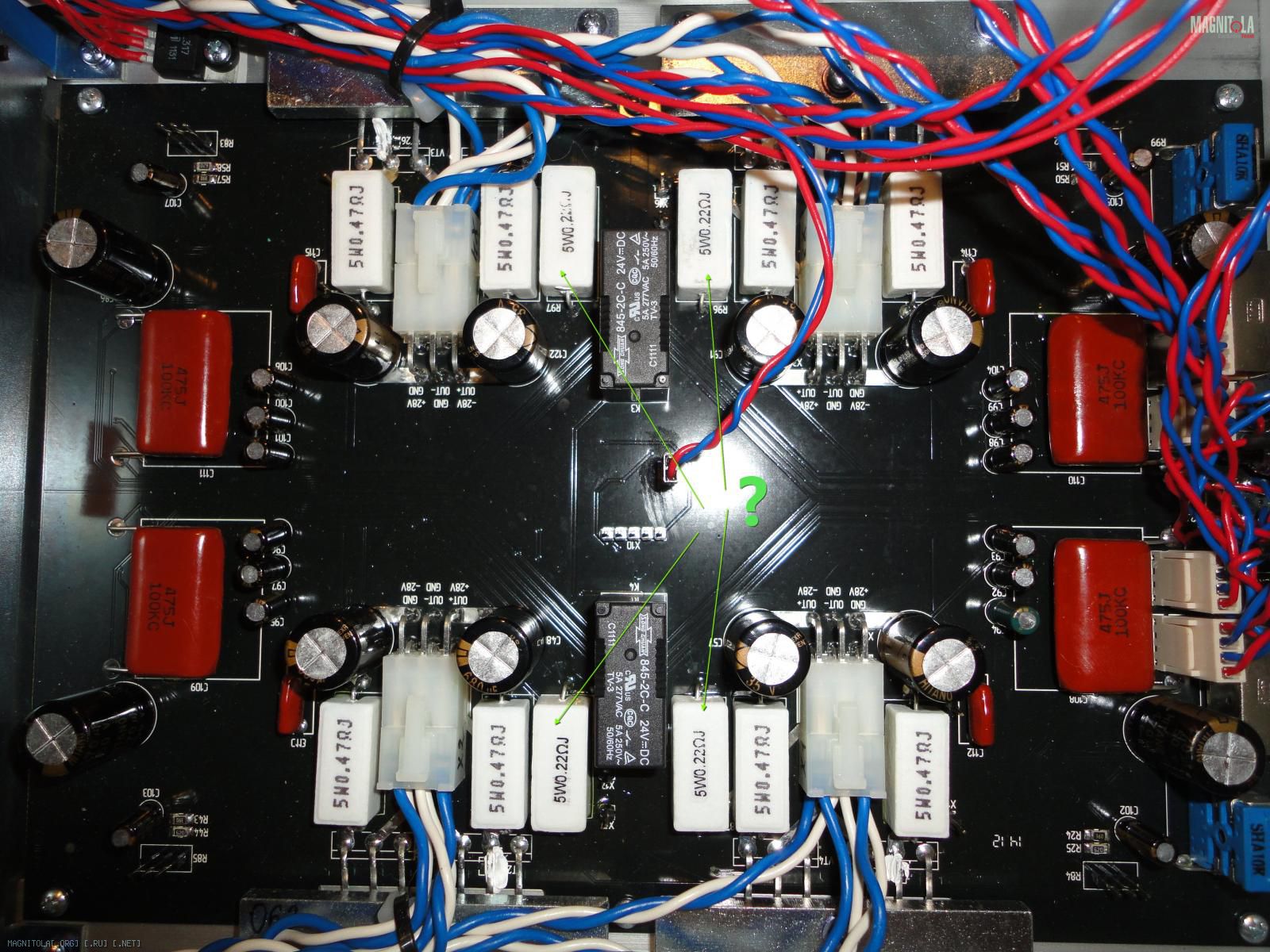 4. Качественные компоненты - транзисторные сборки в дифкаскадах, чип-монтаж основных схем(хороший тепловой баланс схемы, минимальные наводки, хорошая виброустойчивость и т.д.), применение LowESR электролитических и пленочных конденсаторов(работают в широком диапазоне частот, быстро отдают заряд, т.е. могут обеспечить большие пиковые токи в нагрузку и качественную фильтрацию питания), двухсторонние печатные платы с экранирующим подслоем(обратите внимание - основная схема находится в зазоре между металлическим корпусом и металлизацией платы - почти коробочка), выходные МОП-транзисторы делали нам под заказ с большой площадью кристалла(очень хороший тепловой контакт и инерция), проводной монтаж витыми парами всех силовых линий - минимум наводок на слаботочные схемы.