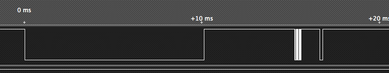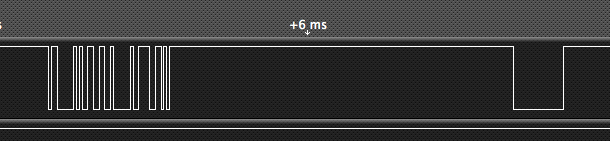 начало посылки - на 10 мс передается 0, потом через 5мс посылка.