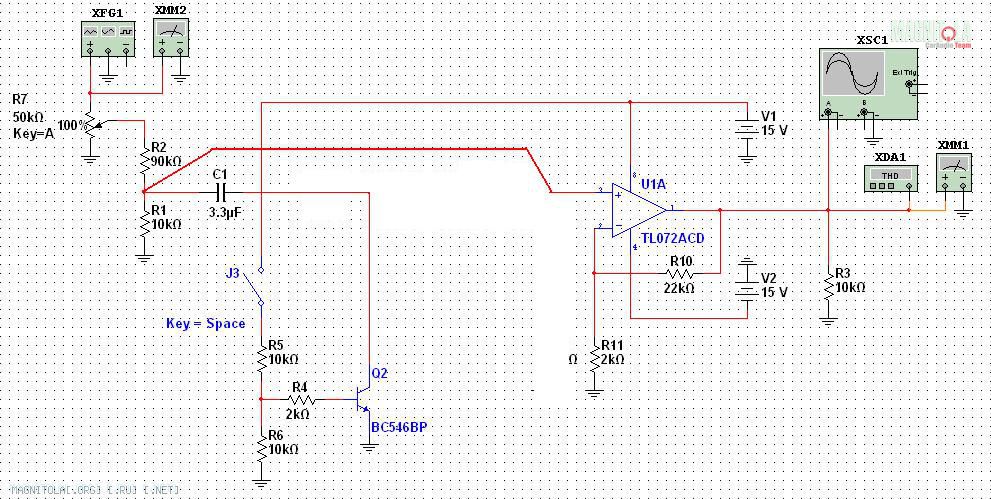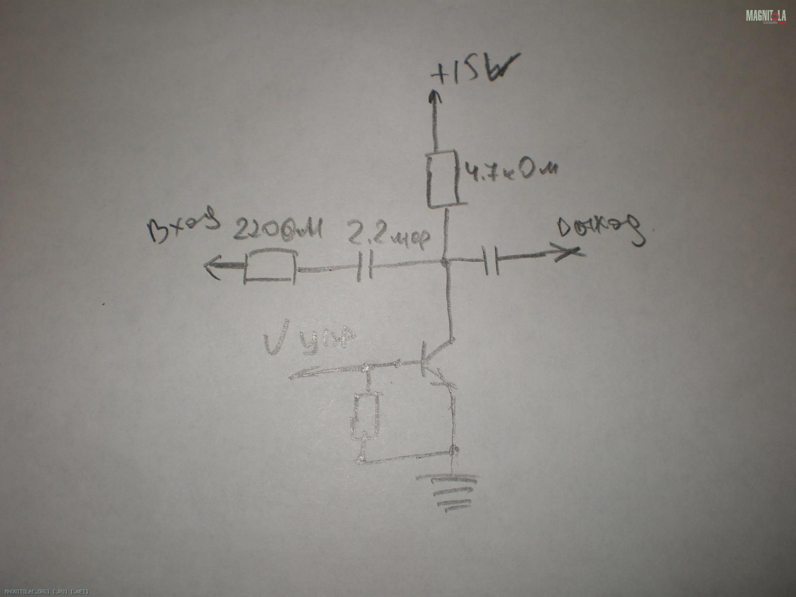 С выхода выходного опера резистор 220 Ом + конденсатор на 2,2-4,7 микрофарад на коллектор npn транзистора.эмиттер на сигнальную землю,на коллектор резюк килоом на 5 и на + питания.