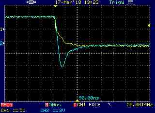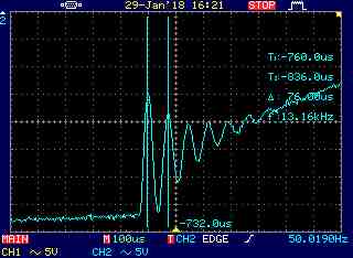 В продолжении исследований, я снял две осциллограммы провалов напряжения при старте DC-DC преобразователей.